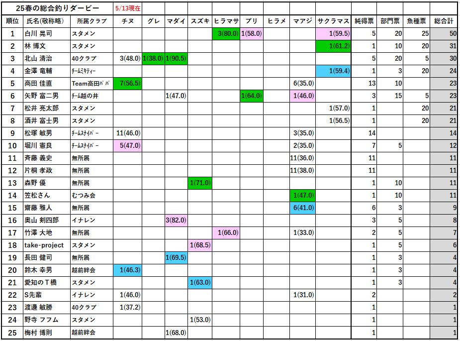 ↓今回は数釣ったけどチヌだけだったので順位は変わらずでした(笑)