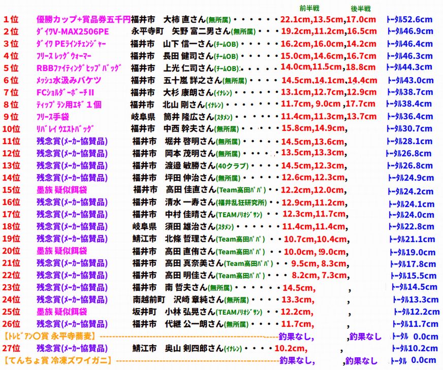 6月21日AM9:00-PM3:00 福井市 上光 仁司さん 22.6cm頭73匹 浜地 (チームOB) 「130mぐれえは投げなあかんざw」 |