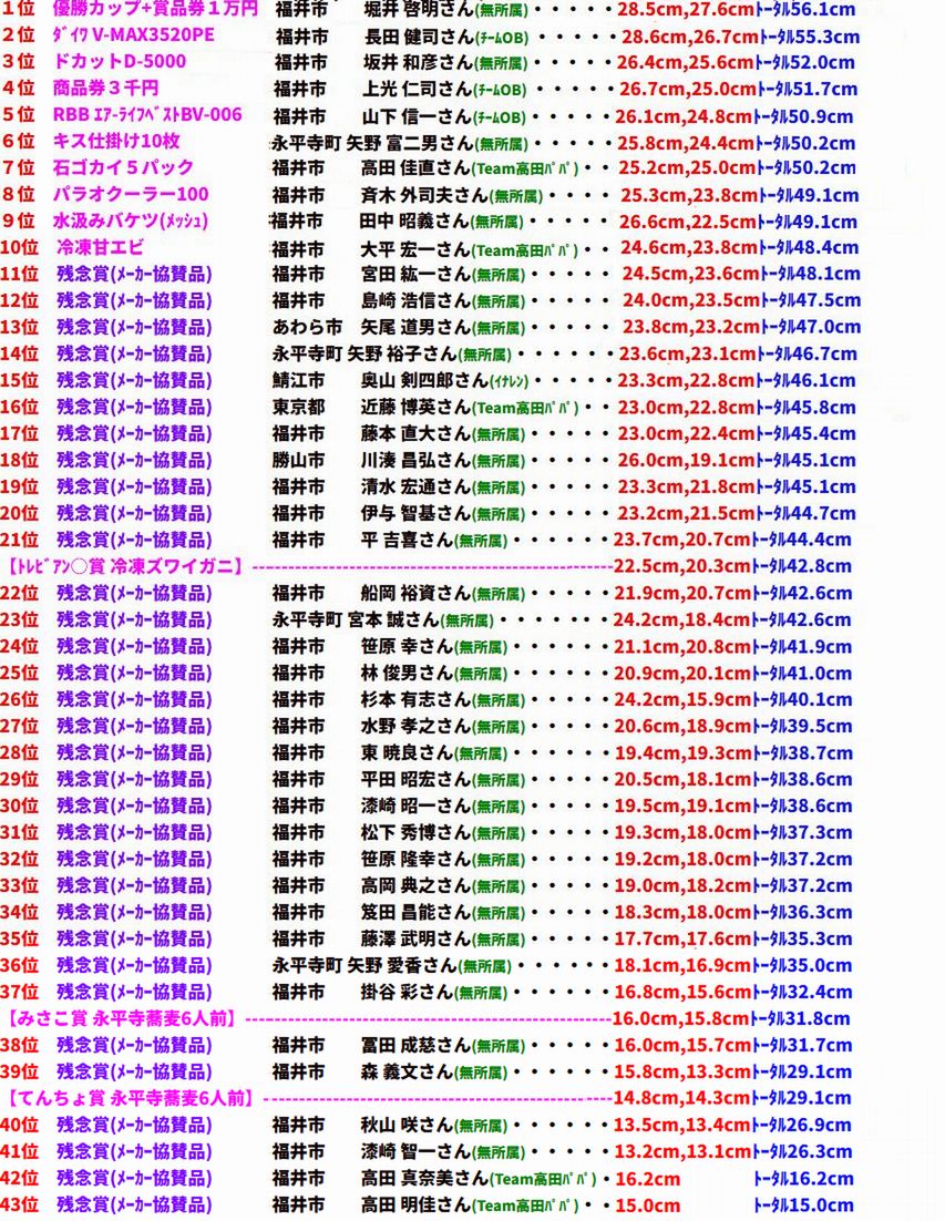 7月10日AM9:30-PM2:00 福井市 上光 仁司さん 22.0cm頭48匹 浜地 (チームOB) |