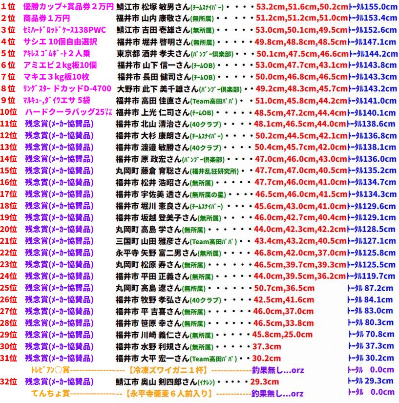 7月20日AM6-10:00 福井市 島崎 浩信さん 23.5cm頭32匹 波松 (無所属) |