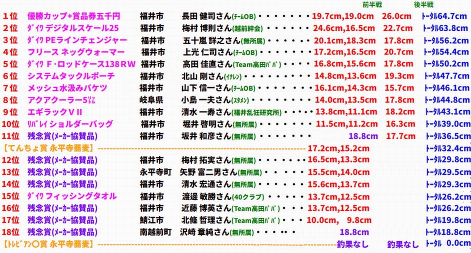 画像をクリックすると裏面へ![]() 5月8日AM10-PM3:00 福井市 高橋 司さん 41.2cm アイナメ45.5cm0.9kg オキアミのエサ ウキふかせin東尋坊 無所属 大会終了後の抽選券2,3票目獲得♪ |