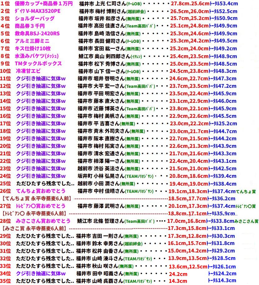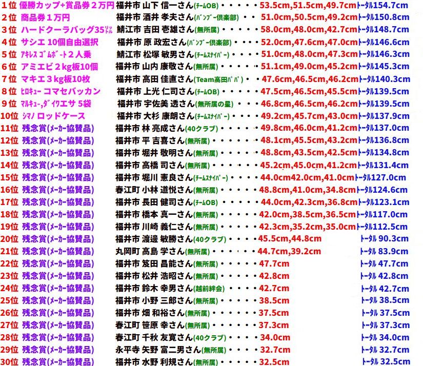 画像をクリックすると裏面へ![]() 5月1日午後 鯖江市 松塚 敏男さん 51.0cm2.6kg他 ハマチ34.0cm 福井市 堀川 憲良さん 44.0cm頭6匹 ハマチ37.0cm頭2匹 オキアミのエサ ウキふかせin福井新港 チームスナイパー 大会終了後の抽選券11,12票目獲得♪ 大会終了後の抽選券1,2票目獲得♪ |