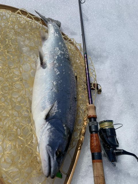 2月15日AM11::45 滋賀 山田 裕さん サクラマス 56.0cmC&R 新幹線上流左岸(フィッシャーズ裏) リバードルフィン13.5g 『軽めのスプーンで流れの際を通したらガツン♪』 “工房帯刀ロッド”入魂2匹目!!