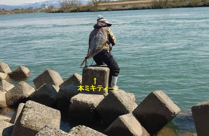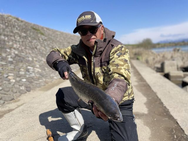 3月31日PM2:07 福井 金澤 竜輔さん サクラマス 65.2cm3.0kg 高屋橋上流右岸テトラ チヌークS21g GR 『あと1本釣りたいな〜♪』 本職は磯釣りトーナメンター♪ 華麗な竿捌きでファイト中〜♪