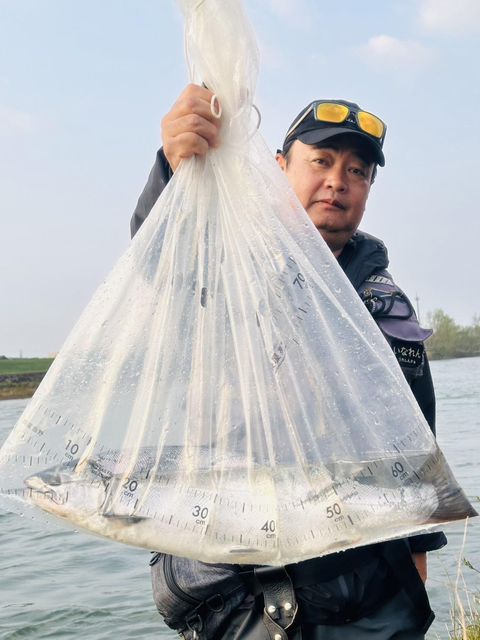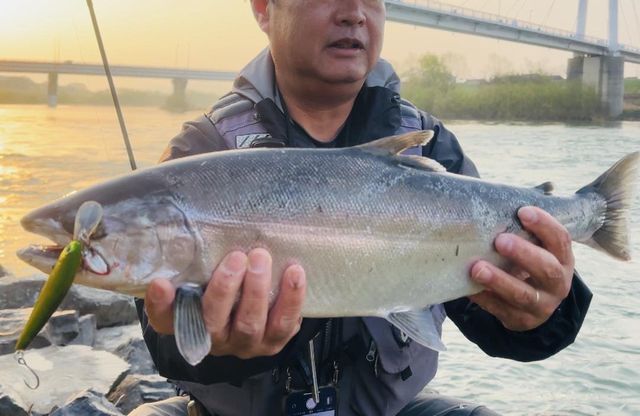 4月7日AM6:10 福井 中山 隆夫さん サクラマス 58.7cm2.6kg 中角歩道橋下流右岸 シュガー2/3ディープSG92Fグリーンゴールド 『朝日とグリーンゴールドがマッチする時間』