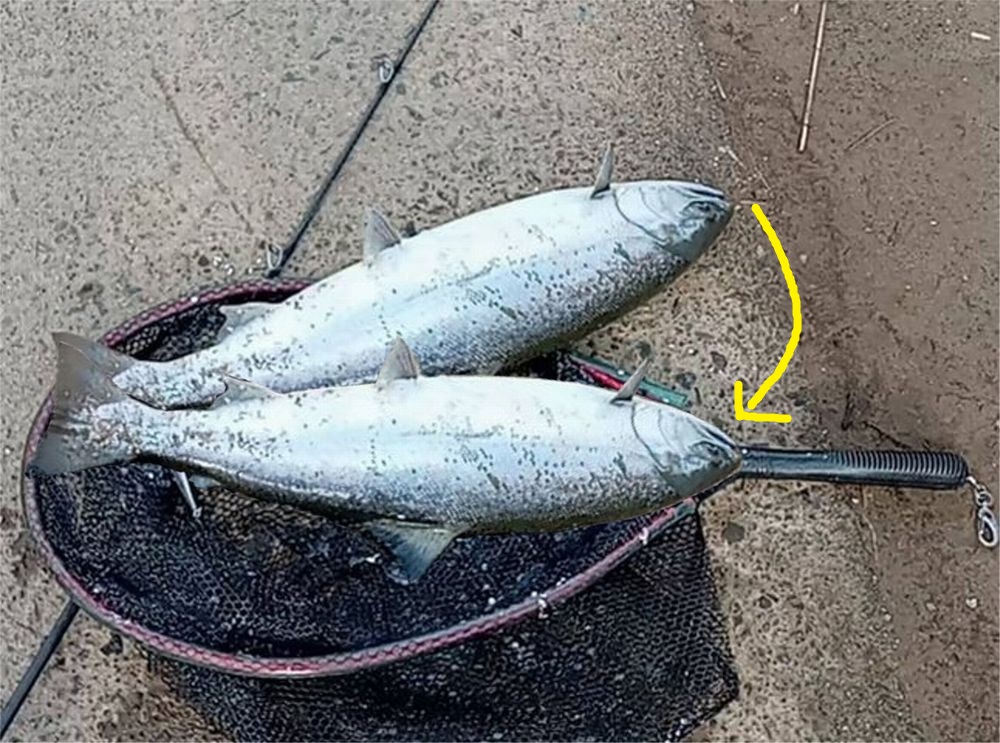 4月9日AM7:36 愛知 ショア鮪さん サクラマス 60cm級C&Escape 高屋橋上流右岸テトラ ドリフトトゥイッチャー85Sメッキアユ 『ああ...晩ご飯のおかずが無くなっちゃった(T_T)』 何センチぐれえだと思いますか?皆様の計測結果を参考にケテーイしたいと思いますw