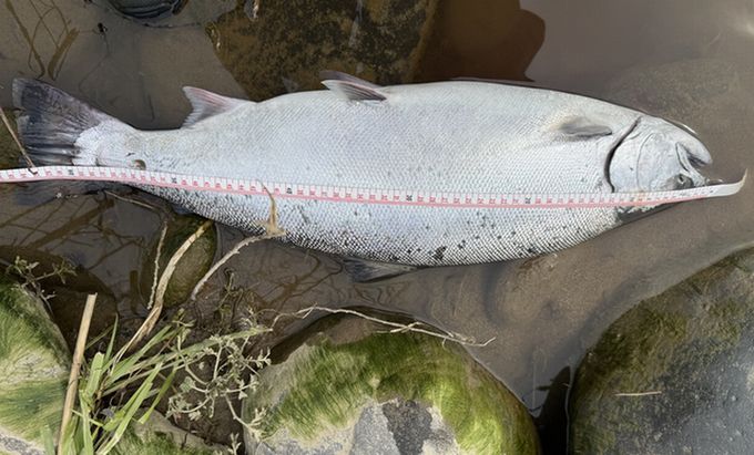 4月26日4月27日PM2:30 埼玉 大垣 力斗さん サクラマス 65.5cm3.9kg 東幼児園前左岸 ドリフトトゥイッチャー100Sブラックキャンディー 『会社のお客さんと来たんだけど...まだサクラ釣ってない方もいるのに...なんとか釣って貰わなきゃ...で、剥製にしろって言われました(^_^;)』