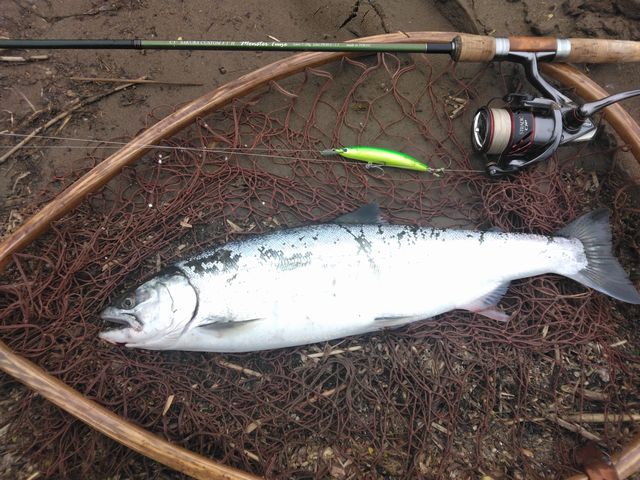 4月28日PM12:30 三重 中世 立夫さん サクラマス 50.3cm1.3kg 中角歩道橋下流右岸 フォトンR95MFライムチャート 『2日連続で釣っちゃってスマンスマック♪』↑この使い方がデフォですw