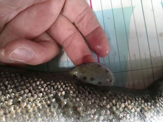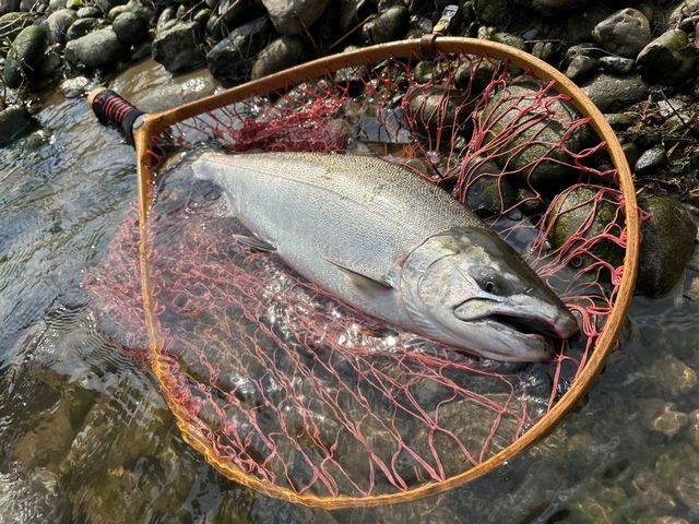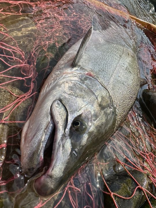 4月29日PM2:30 福井 新郷 廣人さん サクラマス 65.0cm3.6kg(♂) 鳴鹿大堰下流右岸(オフサイド) 桜鱒スプーン メッキVer両面ハンマー18gMHR 『こういう時もあるってw』 曲がった鼻と分厚くて大きいアブラビレですね♪