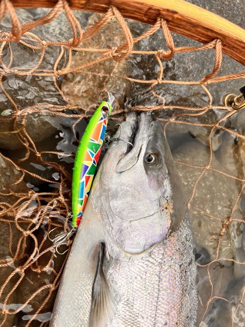 5月4日AM7:30 福井 木村 義文さん サクラマス 50.0cm 福井大橋下流左岸 JAJAMARU90Sクラッシュカラー 『やっと今朝桜鱒釣れました!シーマジャジャマル90s新色のクラッシュカラー』