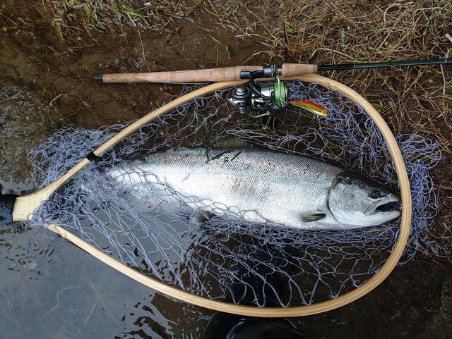 5月9日AM9:00 大阪 河本さん サクラマス 67.0cm3.6kg 東幼児園前右岸 レンジバイブ70ESアカキン 『今晩は自粛していた片町の♀桜ちゃん達と祝杯を挙げますw』 今日のマスももローリングしてかなり抵抗したとか♪