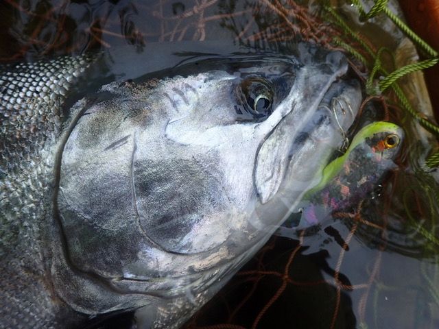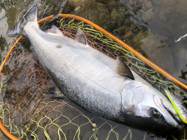 5月14日AM9:55 京都 徳広 吉彦さん サクラマス 63.0cmC&R (現地サッと測りで3.2〜3.4kgでした) 五松橋下流左岸 サムバイブ13GホログラムワカサギYB 『ゆとりを持って遅掛けスタート→眠くて河原で二度寝→スッキリ目覚めて下って行くと、良い流れを見つけられました』