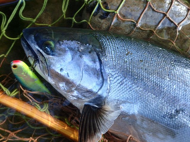 5月14日PM4:05 京都 徳広 吉彦さん サクラマス 58.5cm2.8kg 五松橋下流左岸 サムバイブ13GブルーバックシルバーGB 『こちらは知人希望で連れて帰りましたズンズン歩いて前々日に見かけたデッカいのが好きそうな流れを捜しましたが、この子と同サイズを11時と17時にポカーンとしました』