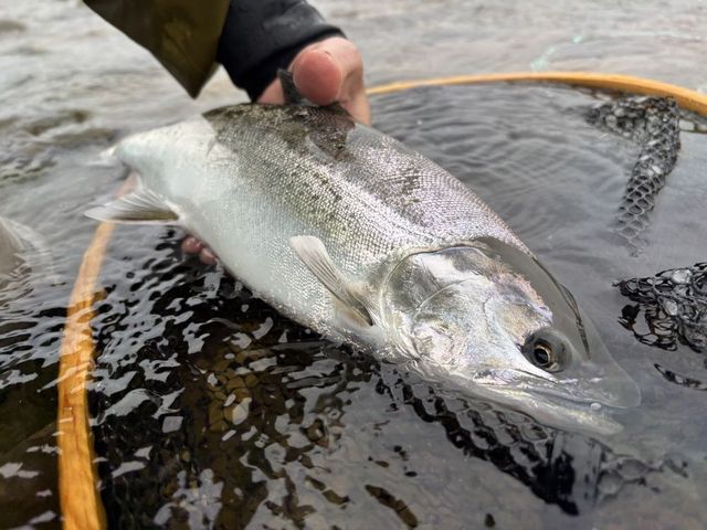 5月24日PM5:36 静岡 macktanibataさん サクラマス 40.6cmC&R 福井大橋上流右岸 フライ ストリーマー 『お店で買ったbrodinのネット枠で最初の1匹を掬うことができました♪』