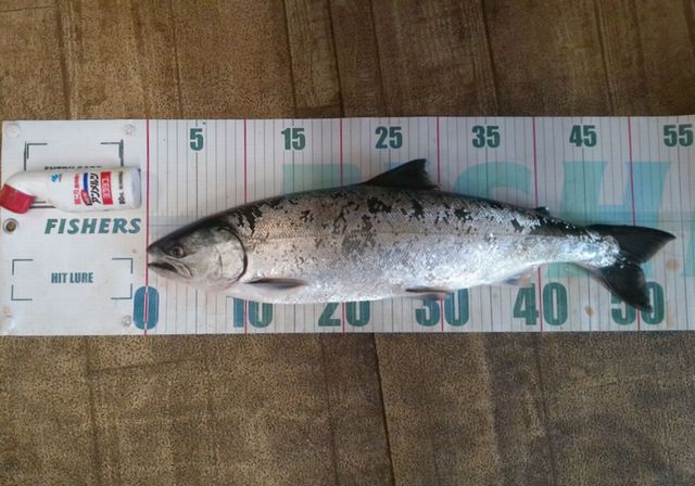 2月14日AM10:00 石川 佛木 直道さん サクラマス 54.5cm1.65kg 九頭竜橋上流左岸 チヌークS17g フルチャート 『ヒットルアーのチヌーク無くしたけど、もうこのカラー売ってない...。』