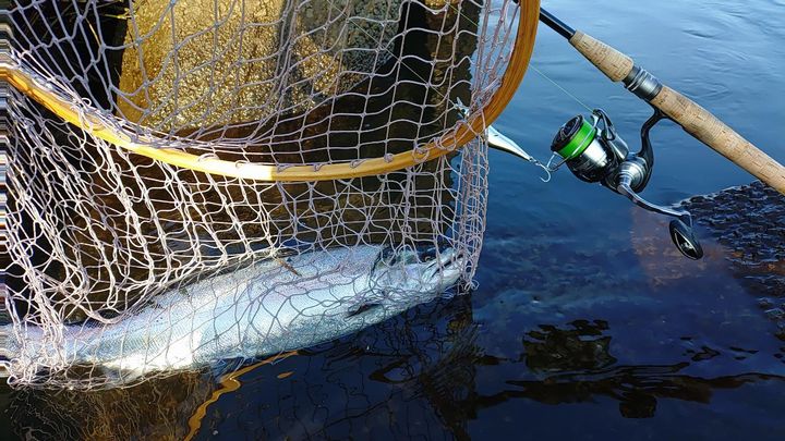 2月14日A8:19 大阪 河本さん サクラマス 63.5cm3.2kg 福松大橋下流左岸 エヴォルーツ99DSライブ鮎 『嫁さんが気持ちよく送り出してくれたんで♪バレンタインデーのプレゼントだねw』